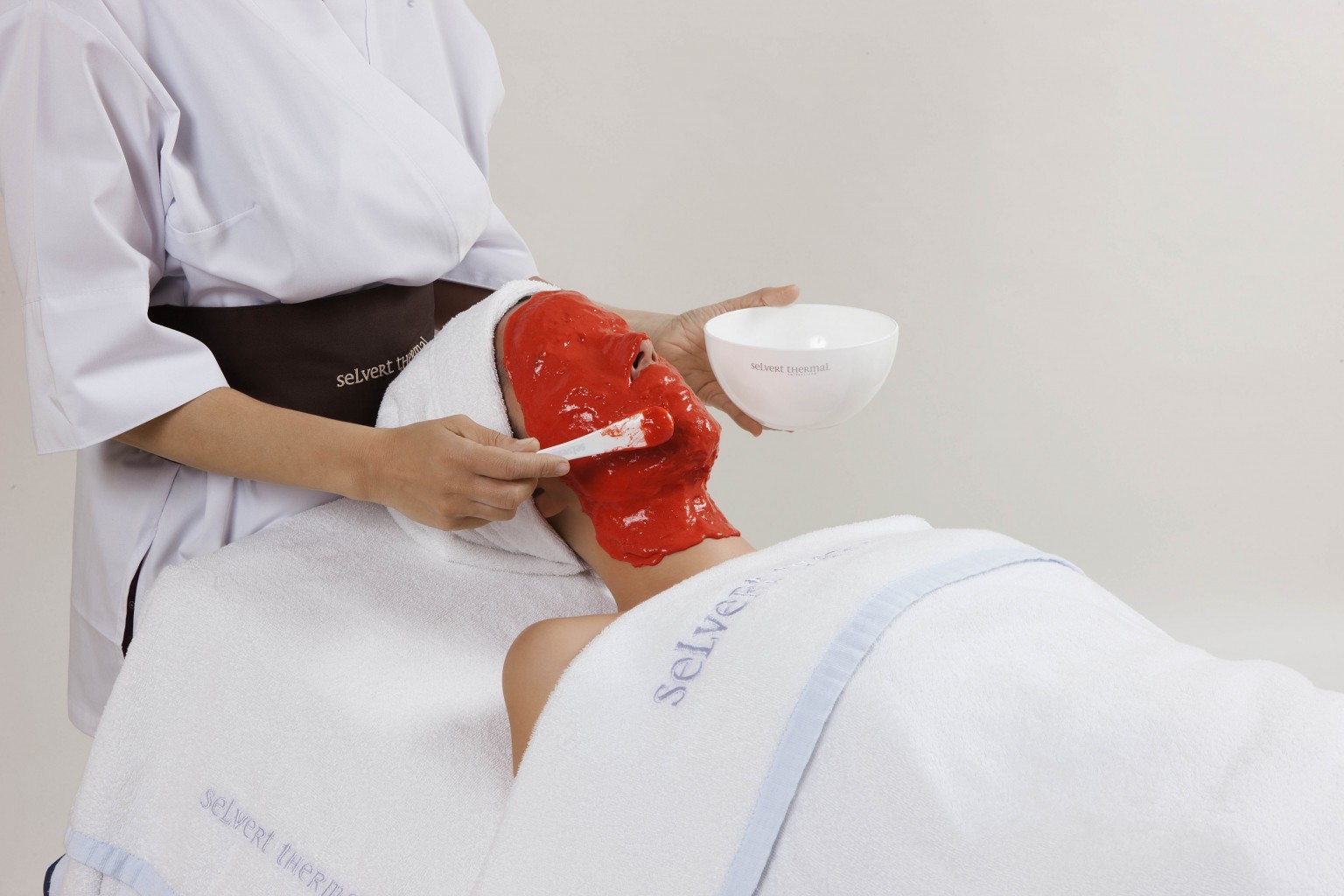 Geben Sie den Inhalt beider Beutel (Gel und Pulver) in eine Schüssel. Vermischen Sie die beiden Phasen. Auf Hals, Gesicht und Dekolleté auftragen. Sie können auch die Augen und Lippen bedecken. 20 Minuten einwirken lassen und dann in einem Stück entfernen.
