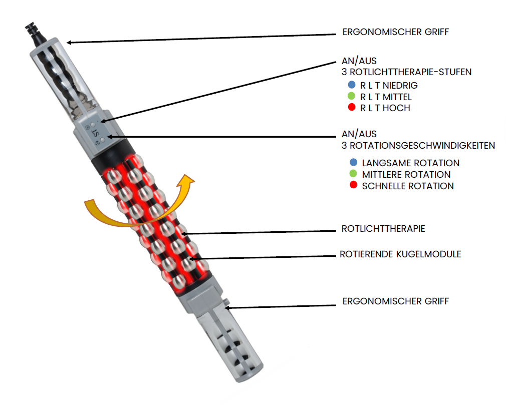 Sein rotierendes System mit Massagekugeln wirkt direkt auf das Gewebe, fördert die Durchblutung, löst Muskelverspannungen und regt die Lymphdrainage an.